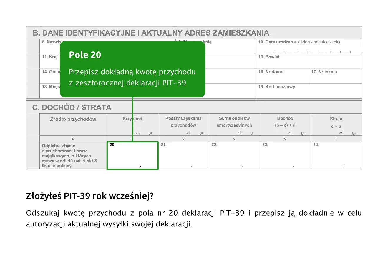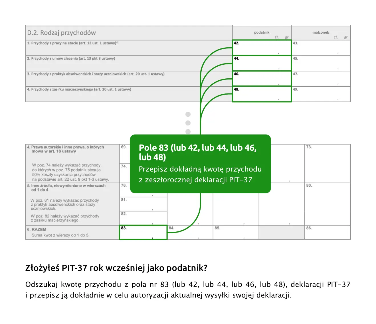 Jeśli składałeś w zeszłym roku np. PIT-37, a w tym roku składasz PIT-36, to należy wziąć kwotę przychodu ze złożonego w zeszłym roku z PIT-37.