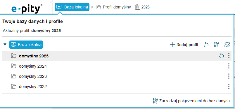 W prawym, górnym rogu programu można przełączyć się między profilami (bazami), jakie mamy dodane w programie: