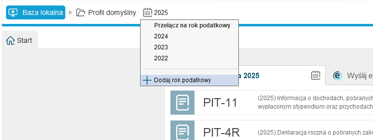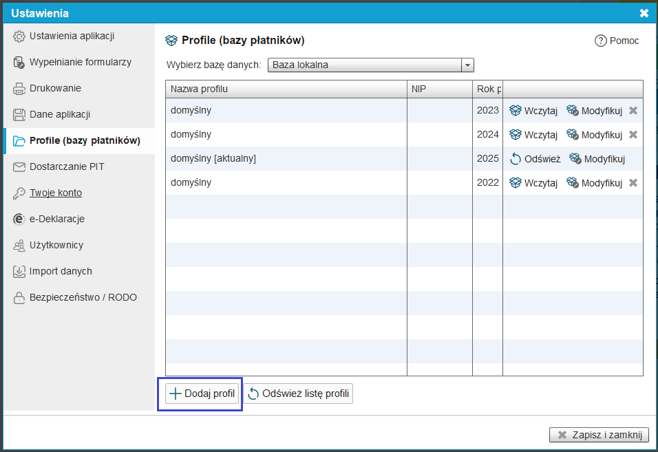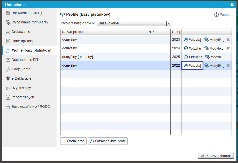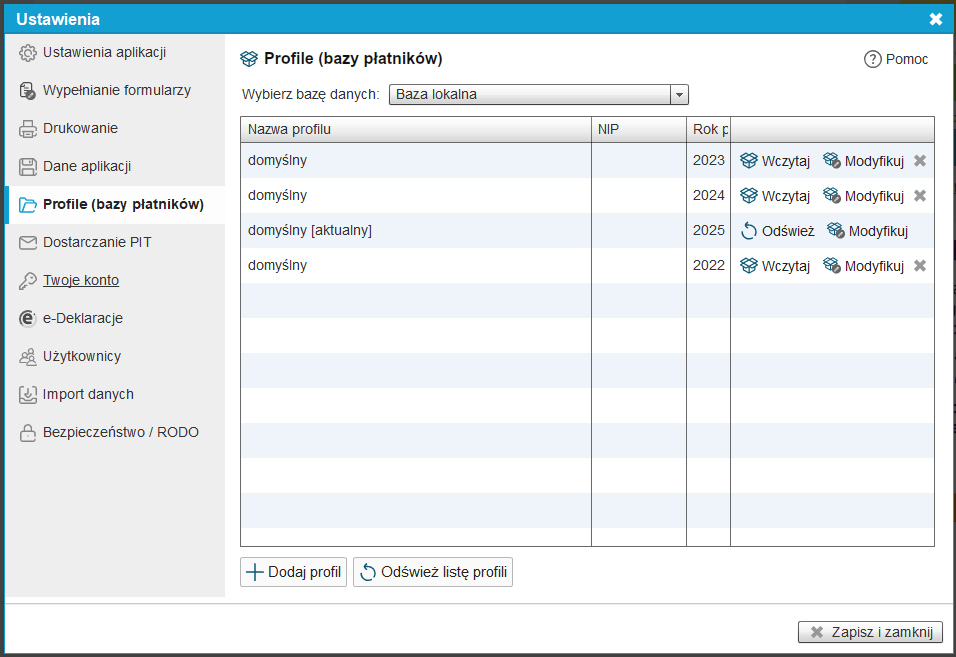 Dodatkowo możemy utworzyć inne profile (bazy płatników) z podziałem na rok podatkowy.