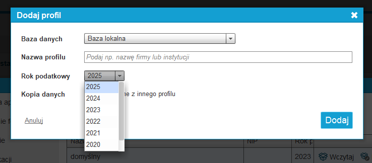 Po przełączeniu profilu (bazy), możemy wybrać rok podatkowy dostępny dla danego profilu (bazy). Z tego poziomu możemy dodać także nowy rok podatkowy przypisany do wybranego profilu (bazy) - opcja Dodaj rok podatkowy.