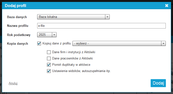 Możemy skopiować dane z innego profilu (bazy), w tym celu należy zaznaczyć przycisk 'Kopiuj dane z profilu' i wybrać dane, które chcemy skopiować.