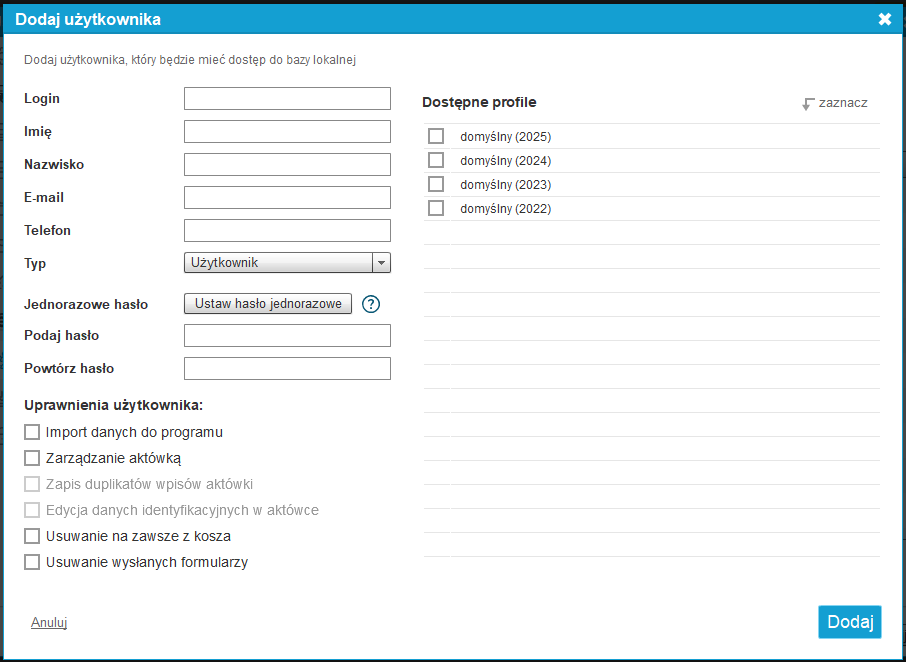 W programie możemy dodać nowego użytkownika (nowych użytkowników), który będzie mógł wejść lub zalogować się do programu.