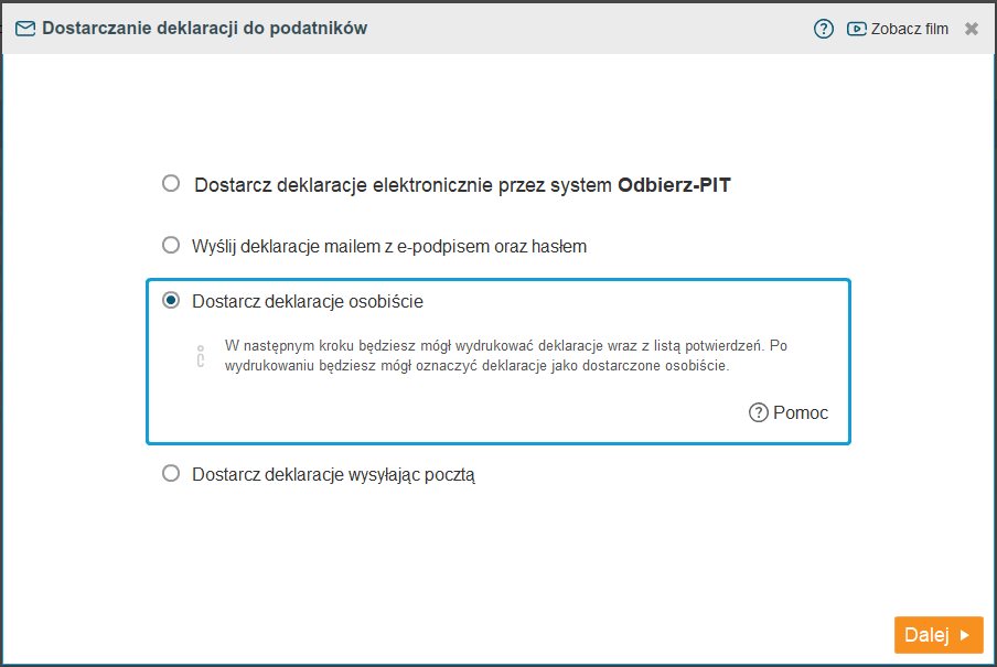 Zaznaczamy opcję 'Dostarcz deklarację osobiście' i klikamy 'Dalej'.