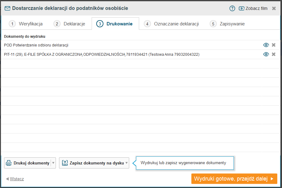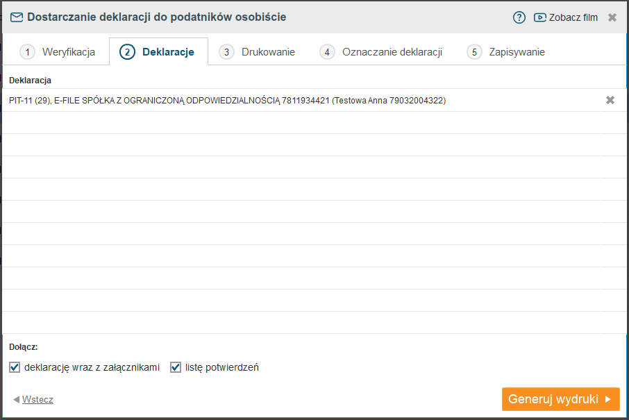 Następuje weryfikacja deklaracji. Jeżeli deklaracje są wypełnione poprawnie, możemy kliknąć w 'Generuj wydruki' (deklaracje wraz załącznikami, listę potwierdzeń). Jeśli pojawi się komunikat o błędnie wypełnionej deklaracji, należy ją poprawić i wybrać ponownie opcję dostarczania.