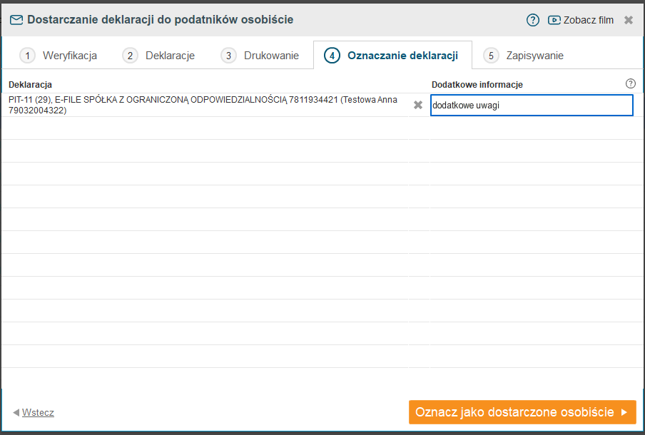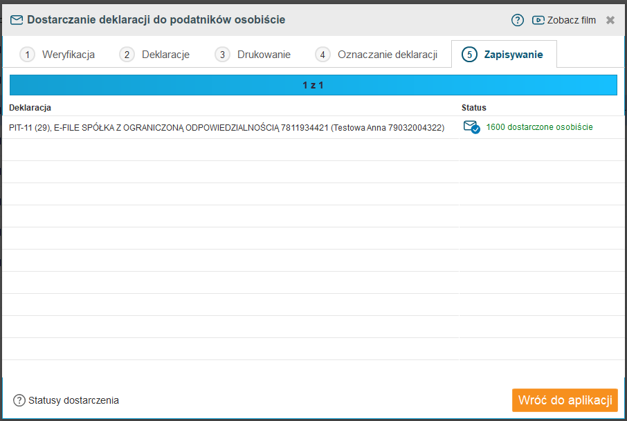 Po kliknięciu w 'Oznacz jako dostarczone osobiście', przechodzimy do ostatniego okna, w którym są widoczne statusy dostarczanych deklaracji.