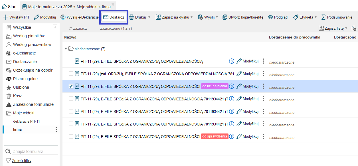 Zaznaczamy osoby, dla których chcemy dostarczyć PIT i klikamy w opcję 'Dostarcz',