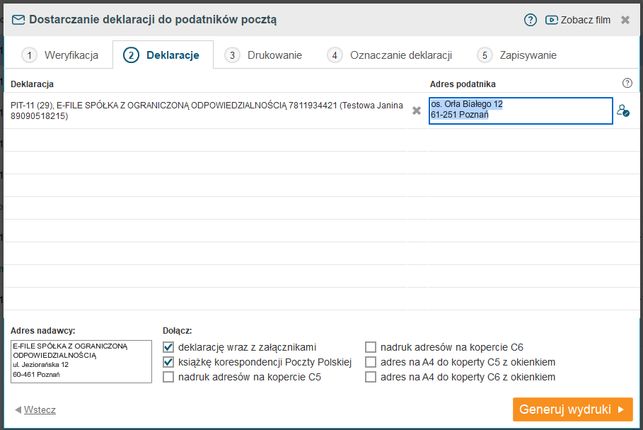 Jeżeli wszystkie deklaracje są wypełnione poprawnie, możemy przygotować deklaracje do wysyłki tradycyjnej, czyli np. sprawdzić czy wpisany adres podatnika jest poprawny, dołączyć do wydruku deklaracji książkę korespondencji Poczty Polskiej, odpowiednie nadruki na kopercie lub adresy do kopert, następnie klikamy Generuj wydruki.