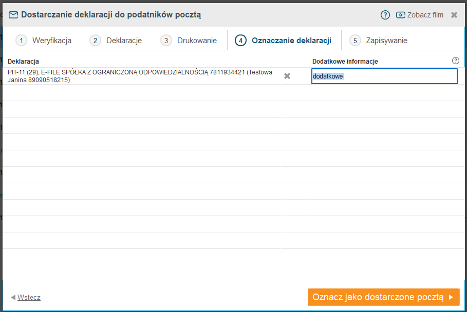 Następnie możesz oznaczyć deklaracje jako dostarczone pocztą - w polu dodatkowe informacje możesz wpisać datę wysłania deklaracji lub numer przesyłki poleconej i kliknąć 'Oznacz jako dostarczone pocztą'.