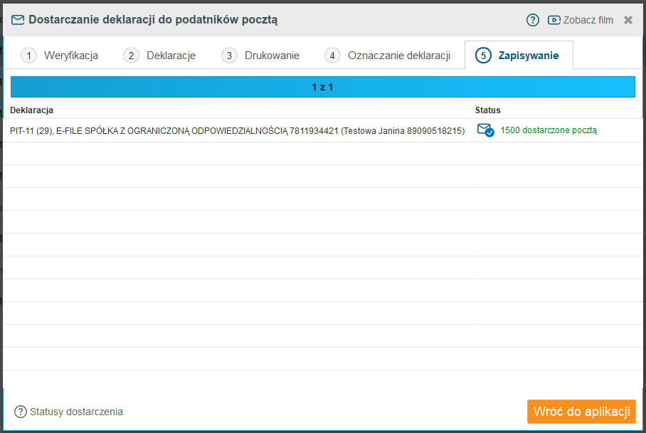 Wyświetli się okno ze statusem dostarczenia - 1500 dostarczone pocztą. Możesz wrócić do aplikacji klikając w 'Wróć do aplikacji'.