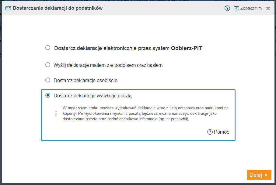 wybieramy formę dostarczenia 'Dostarcz deklaracje wysyłając pocztą' i klikamy 'Dalej'.