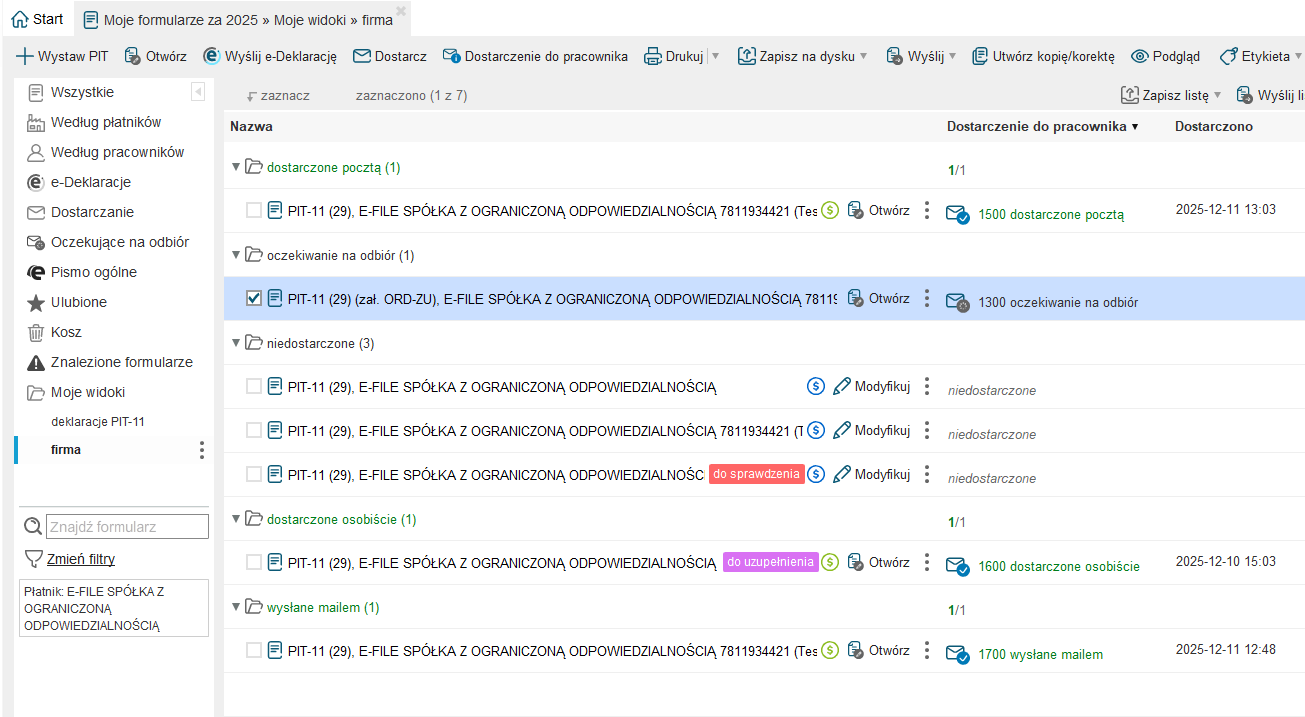 Status wysłanej elektronicznie do pracownika deklaracji można sprawdzić w oknie 'Moje formularze' w zakładce 'Dostarczanie', kolumnie 'Dostarczenie do pracownika'.