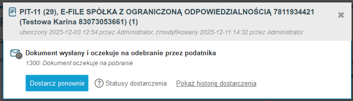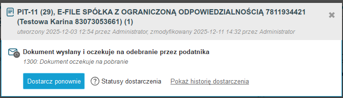 Jeśli deklaracja nie została odebrana przez podatnika i cały czas widnieje przy niej status 1300 'Dokument oczekuje na pobranie' można spróbować dostarczyć ją ponownie klikając na 'Dostarcz ponownie’'