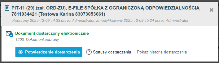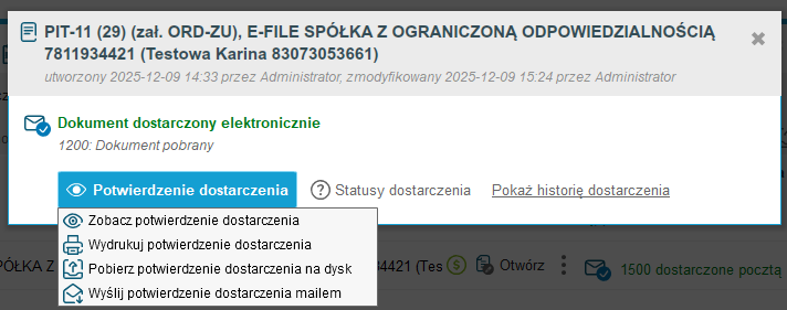 Jeśli deklaracja otrzymała status 1200, wówczas z poziomu okna 'Status dostarczenia' można kliknąć na opcję ‘Potwierdzenie dostarczenia’ i wydrukować lub zapisać w pliku pdf na komputerze jej potwierdzenie.