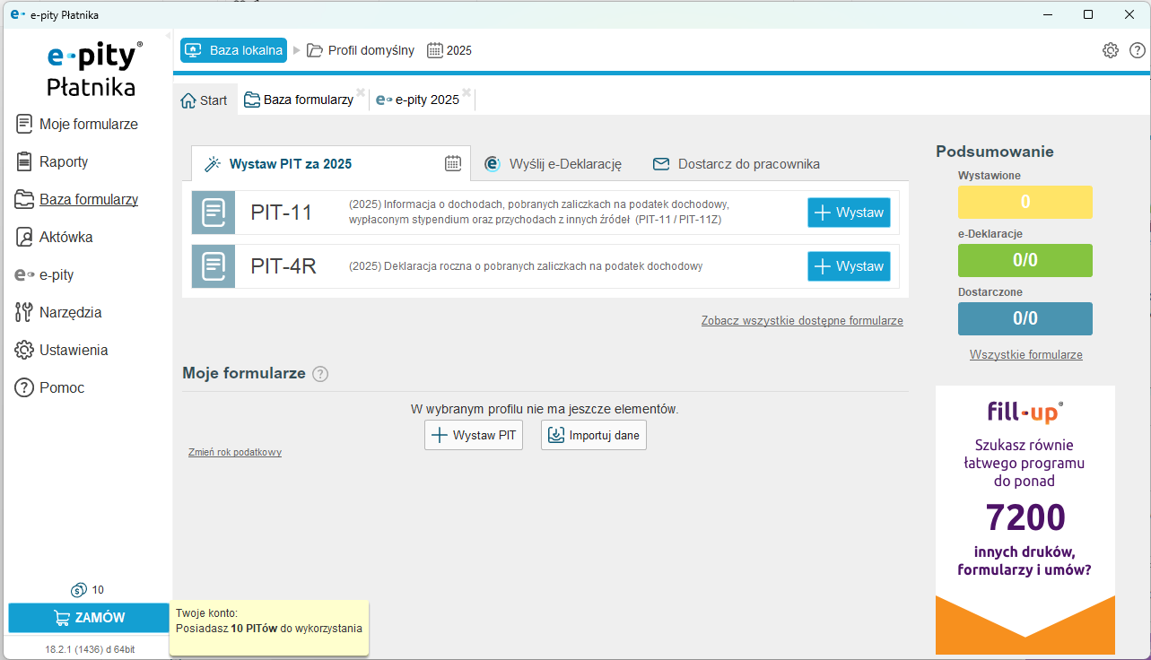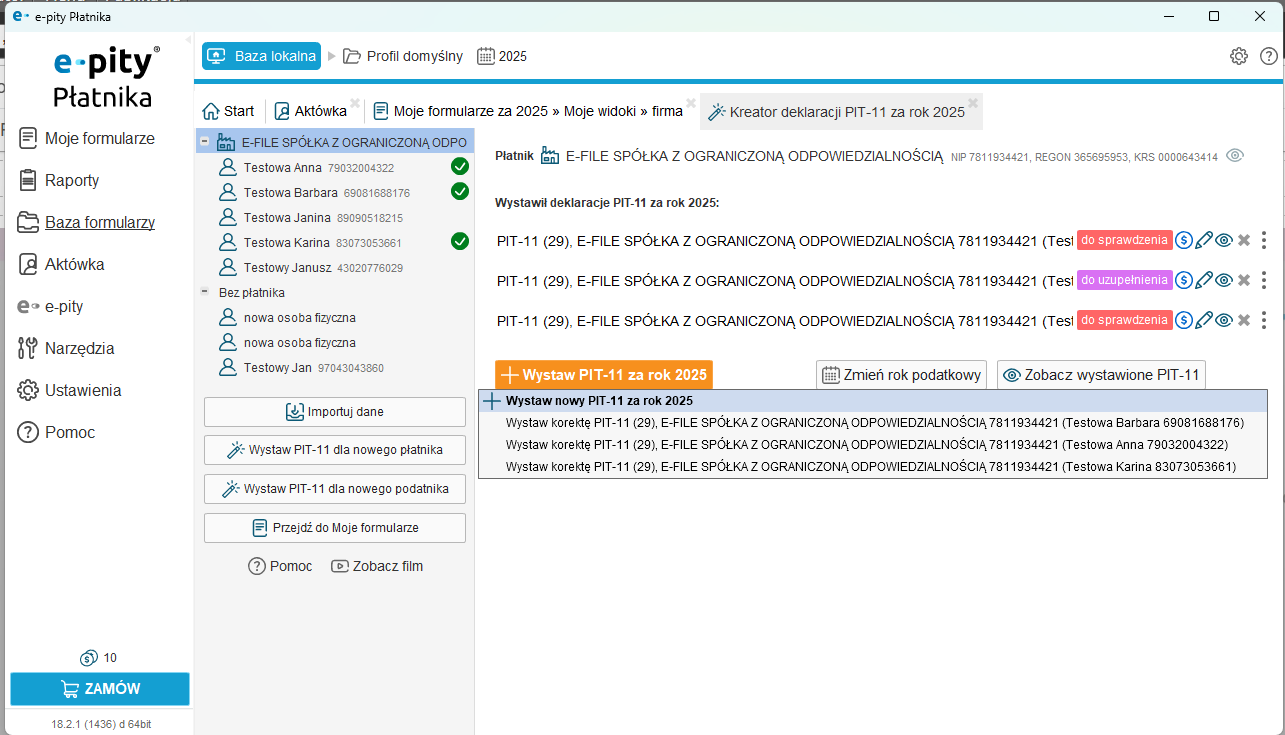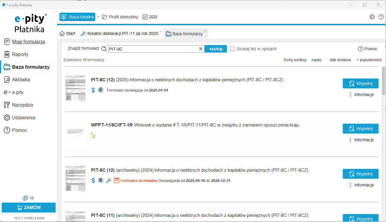 Kreator deklaracji dla PIT-8C jest dostępny z poziomu "Baza formularzy".