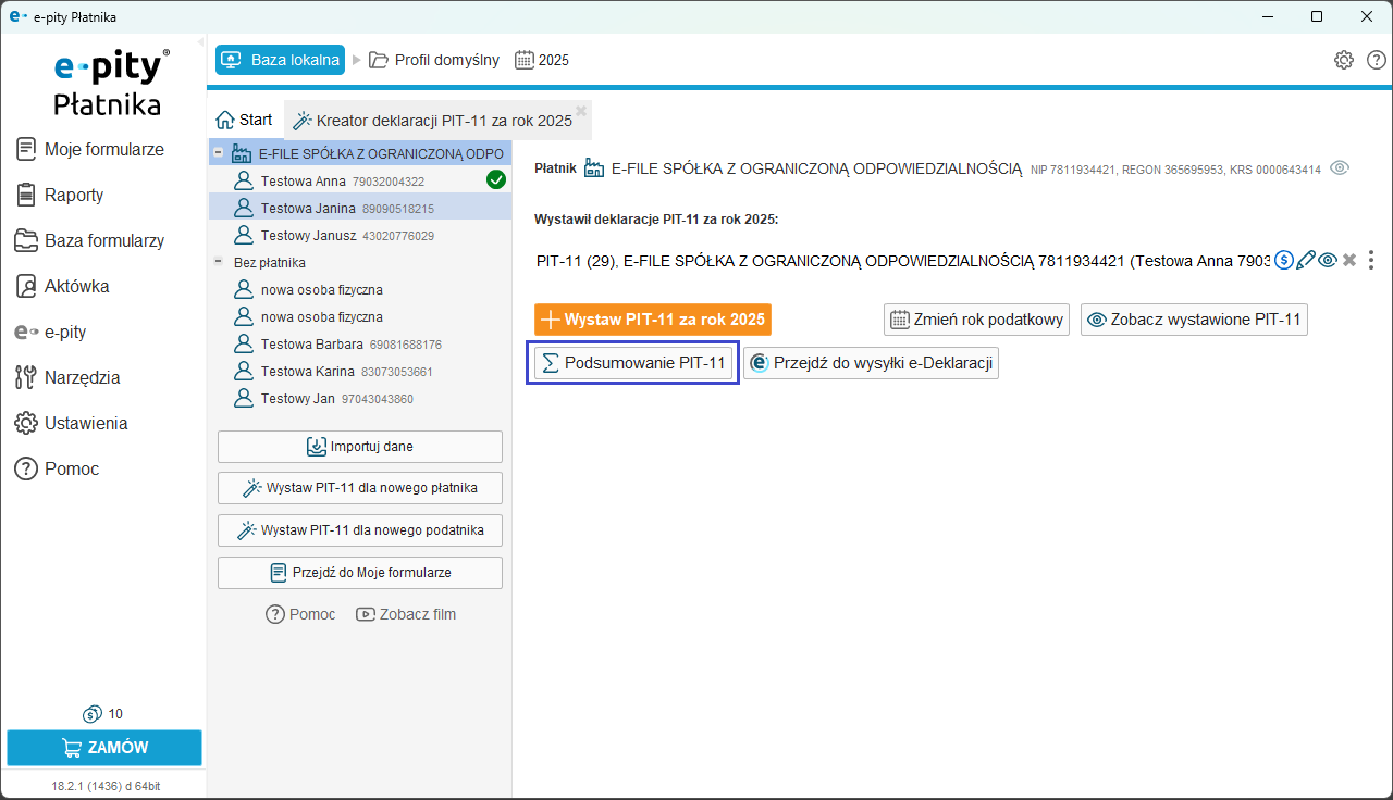 Po kliknięciu w nazwę firmy wyświetli się lista wystawionych deklaracji PIT-11. Z tego poziomu można kliknąć w 'Podsumowanie PIT-11'.