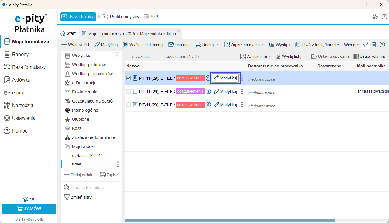 Wszystkie wypełnione i zapisane w programie deklaracje znajdziesz w zakładce 'Moje formularze'. Każdą zapisaną deklarację możesz w każdej chwili obejrzeć / otworzyć lub zmodyfikować klikając w przycisk 'Modyfikuj'.