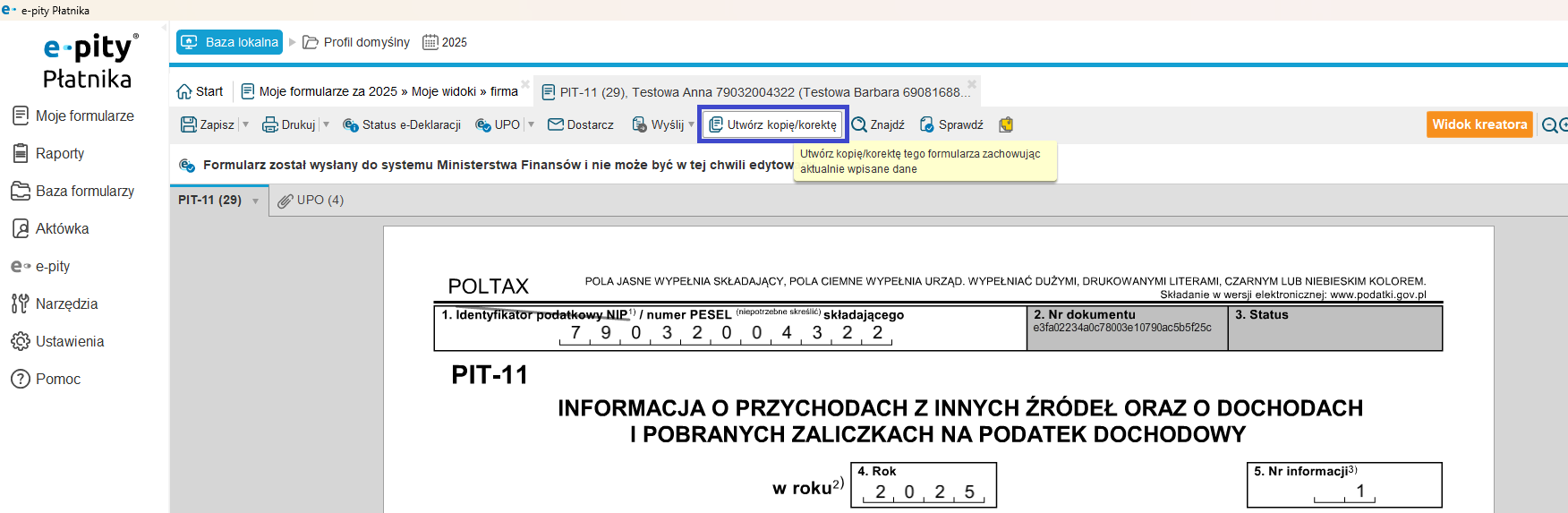 Można będzie natomiast zrobić jej kopię, klikając na przycisk 'Utwórz kopię/korektę' i wprowadzić ewentualnie poprawki i przygotować do wysyłki jako korektę zeznania.