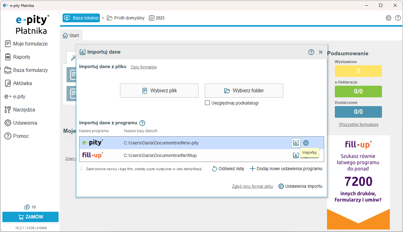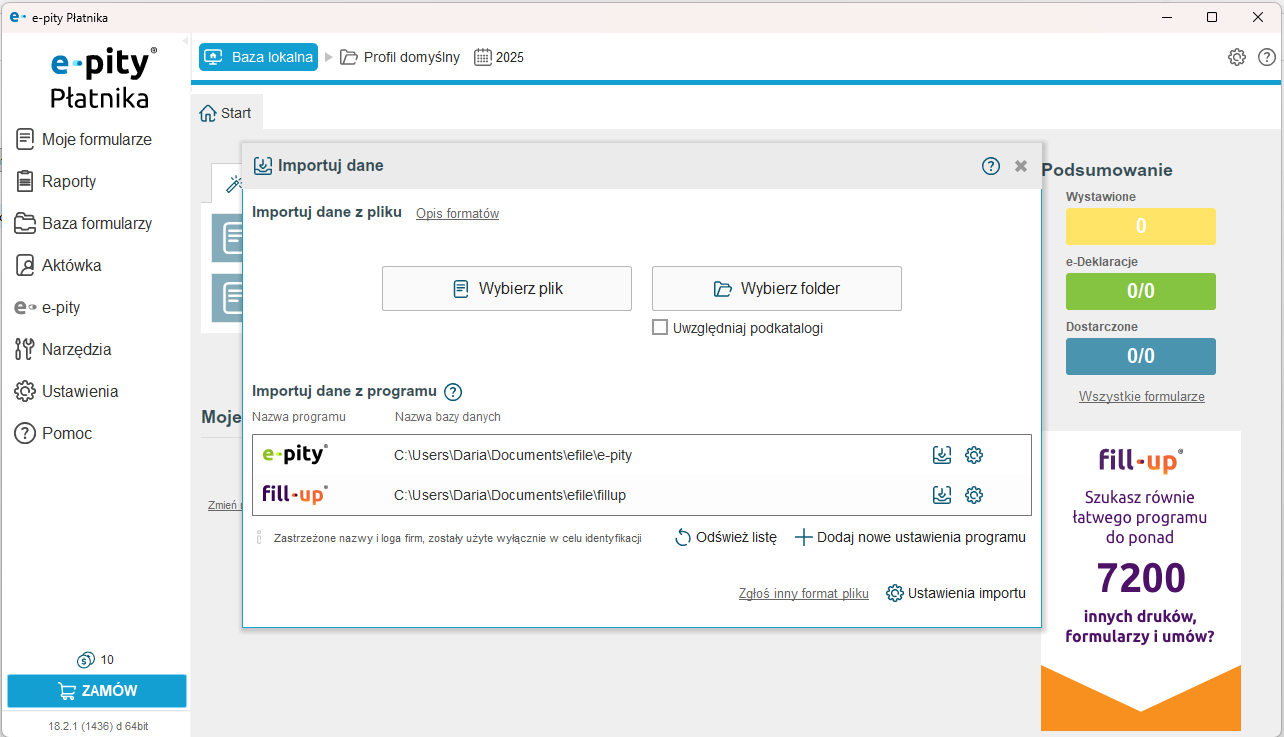 W e-pitach Płatnika możemy skorzystać z automatycznego importu danych z programów księgowych takich jak: Biuro IPS, DRUKI Gofin, enova365, InsERT, Optima, PIT Format, Płatnik, eDek, jak również z innych programów firmy e-file: fillup formalności wypełnione oraz z aplikacji e-pity.