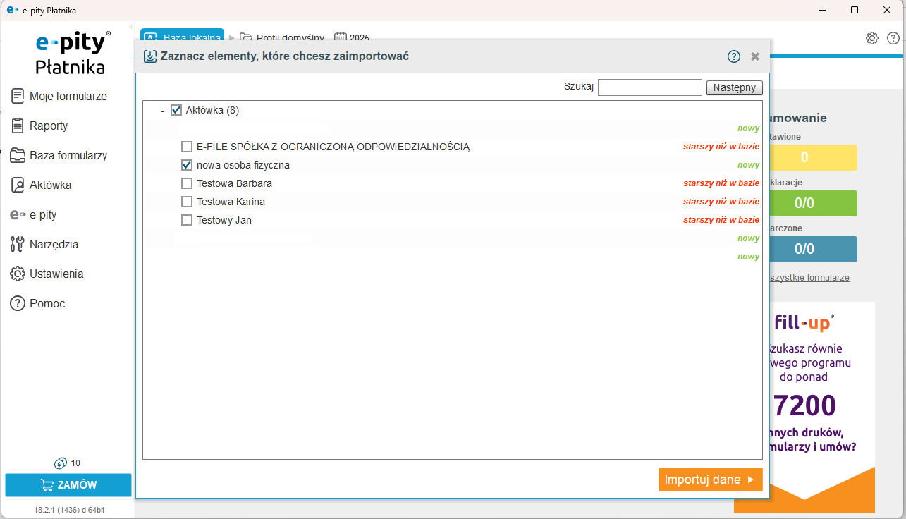 W oknie importu przy każdym wierszu wyświetli się informacja, czy importując dane, dodamy nowy wpis (osobę /firmę /formularz), czy też mamy już zapisane w programie dane tej osoby lub firmy.