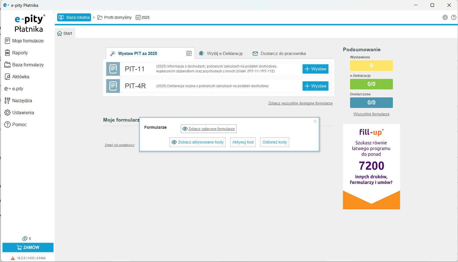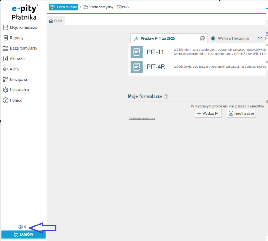 Chcąc sprawdzić jaki pakiet PIT mamy wykupiony i czy wystarczy nam do rozliczenia wszystkich deklaracji za dany rok podatkowy, klikamy w programie w dolnym lewym rogu w ikonkę monet: