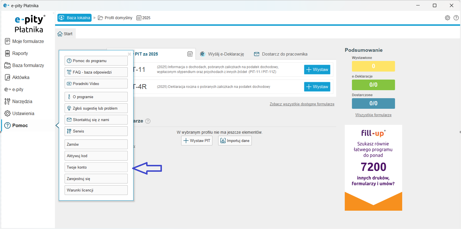 lub wybieramy z bocznego menu Pomoc-> Twoje konto.