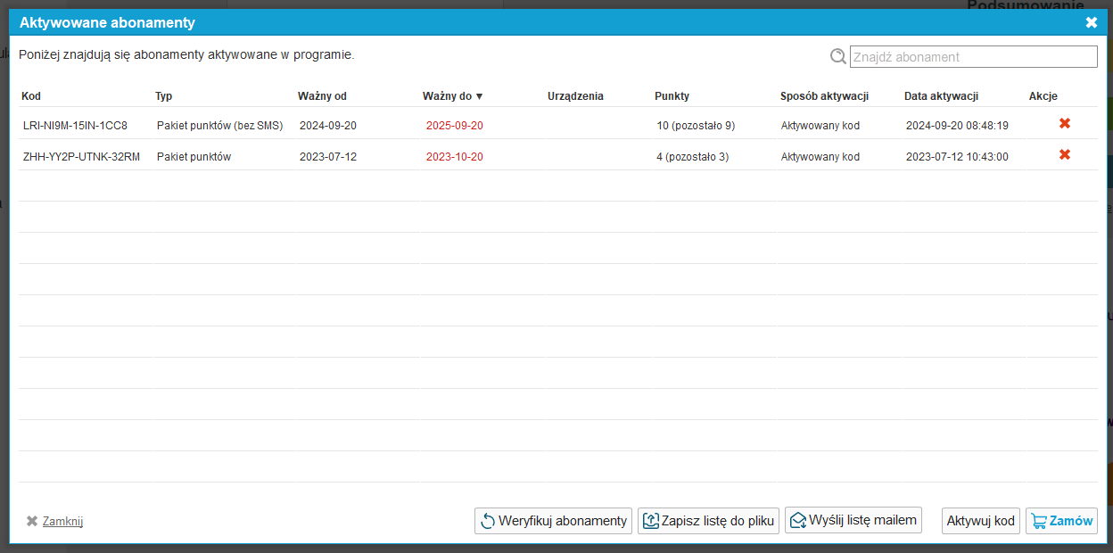 Klikając w 'Zobacz aktywowane kody', wyświetli się informacja o kodach aktywowanych w programie: