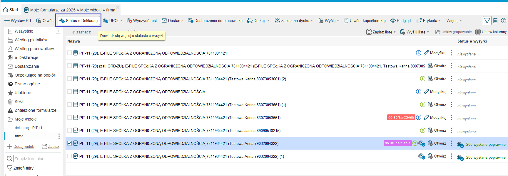Opcja 'Status e-Deklaracji' z poziomu 'Moje formularze':