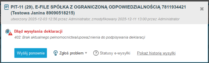 Jeśli deklaracja nie została wysłana pomyślnie (otrzymała inny status niż 200), wówczas po kliknięciu w ikonę 'Status e-Deklaracji' pojawia się informacja o błędzie wysyłki i odpowiedni numer statusu błędu.