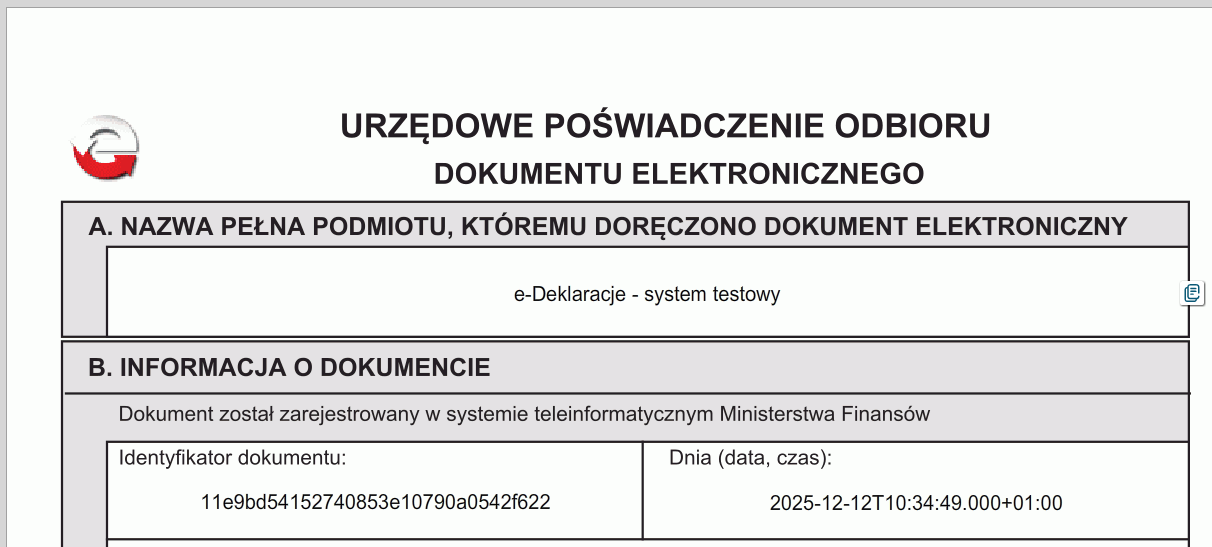 Podczas wysyłki normalnej na bramkę e-Deklaracji podmiotem odbierającym e-Deklarację i wystawiającym UPO jest ‘Ministerstwo Finansów’.