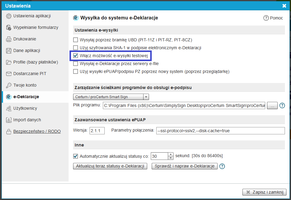 Aby wysłać testowo deklarację do bramki testowej e-Deklaracje, należy przejść (użytkownik musi posiadać prawa administratora) do Ustawienia -> e-Deklaracje i w sekcji 'Ustawienia e-wysyłki' zaznaczyć 'Włącz możliwość e-wysyłki testowej'. Po zaznaczeniu tej opcji należy zapisać zmiany (przycisk w prawym dolnym rogu 'Zapisz i zamknij').